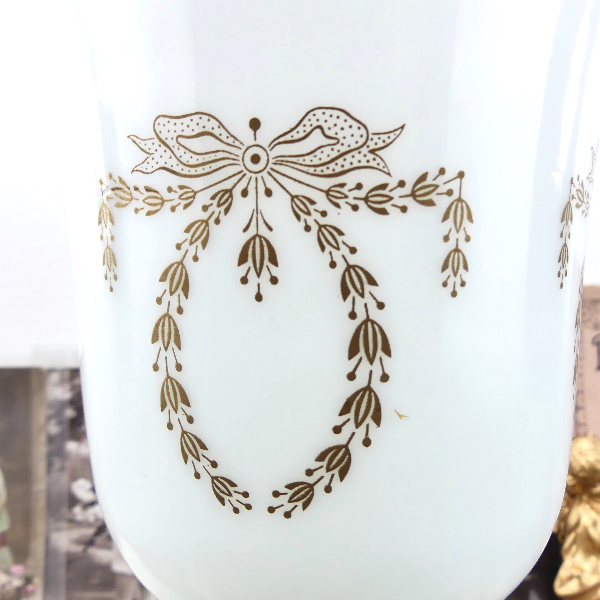 Here is a large vase cut in white opaline. It is adorned with delicate golden decorations in the royal style.