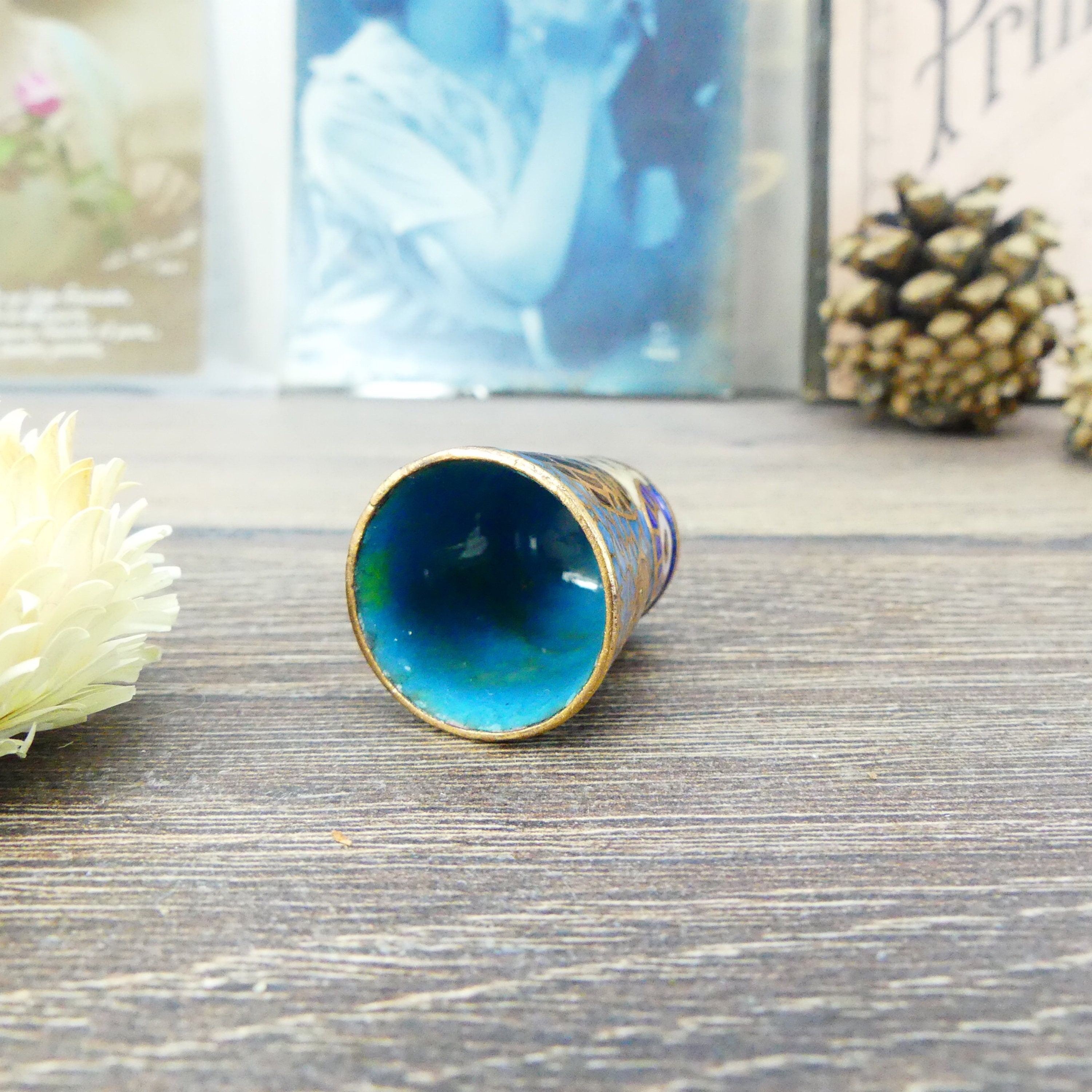 Here is a nice little thimble for lovers of beautiful objects. It is made of enameled porcelain. The bird and flower designs are Japanese style. The interior is blue. He is magnificent!
