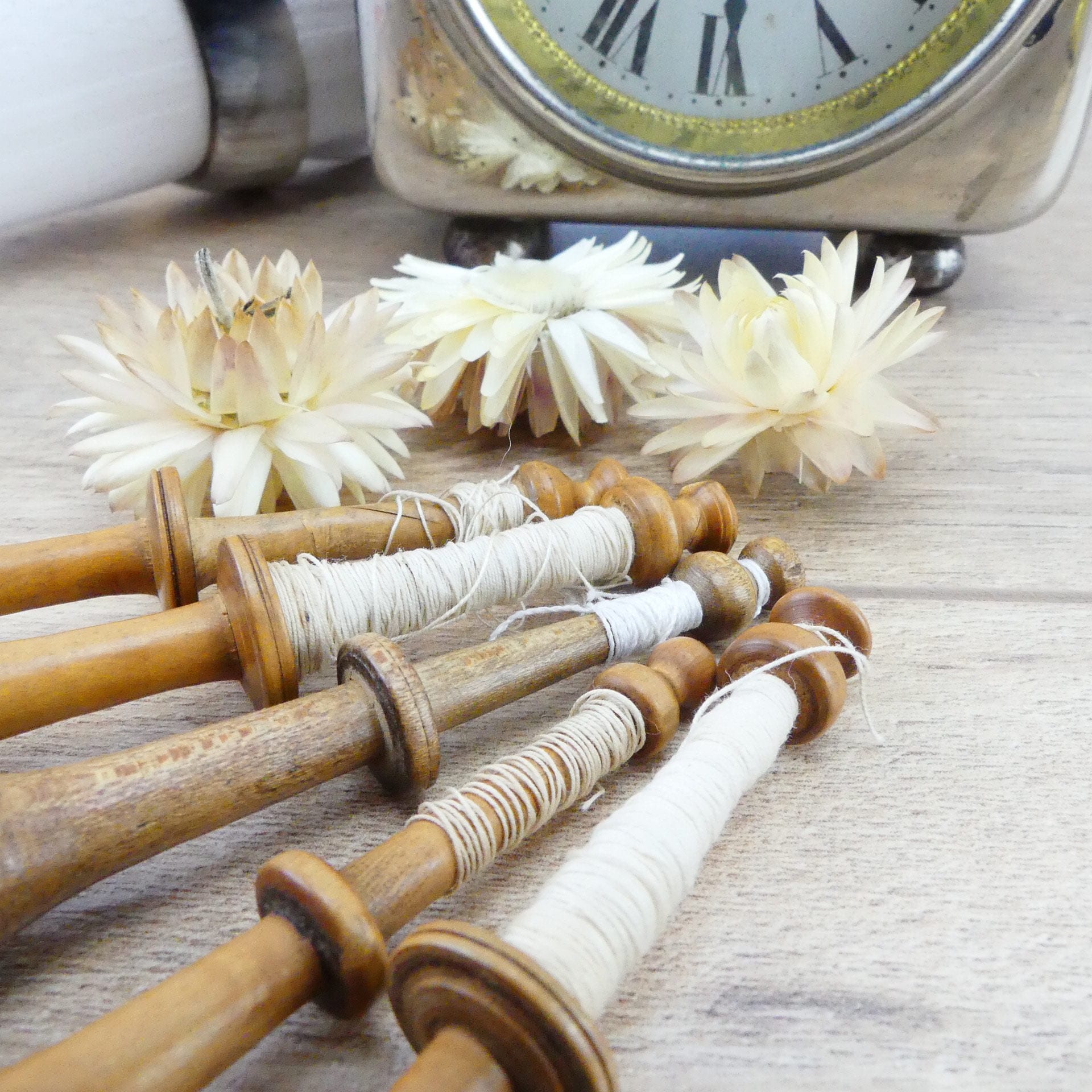 Here is a set of 5 old lace spindles used by lace-makers in the Haute-Loire region of France. They still have their original thread.