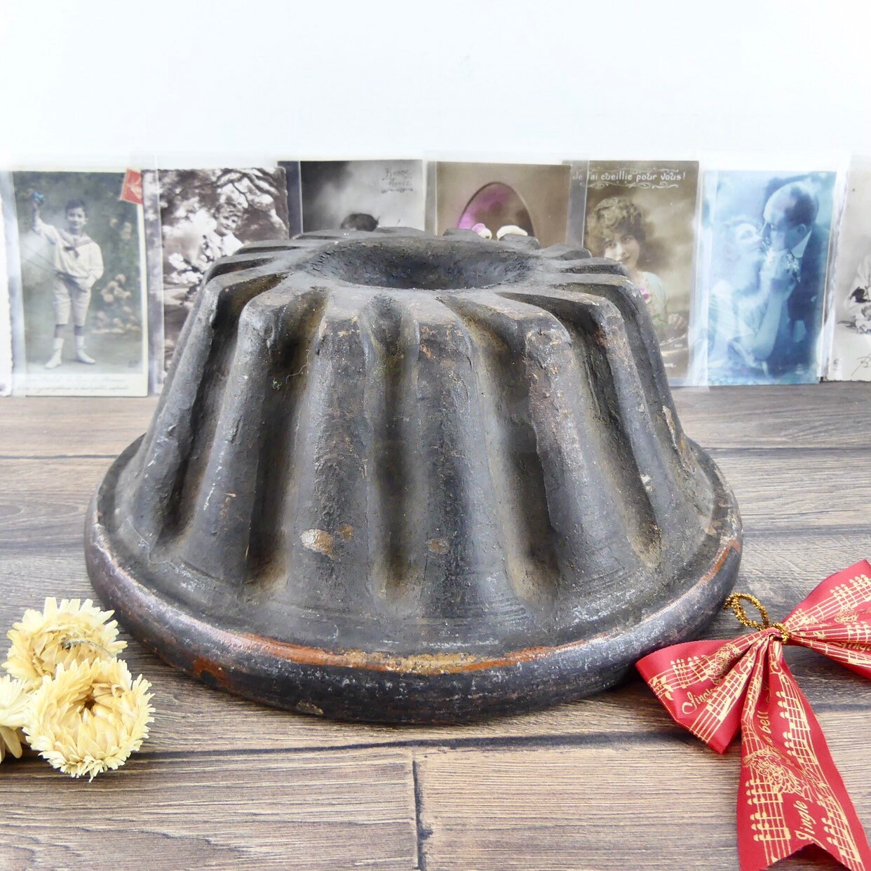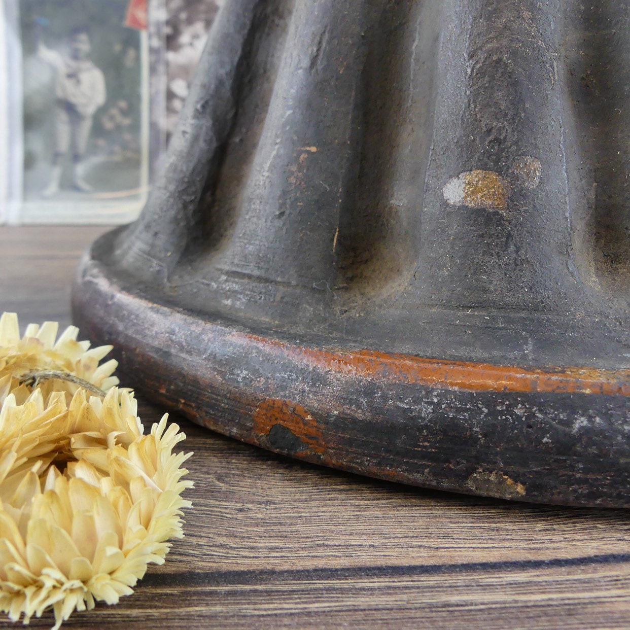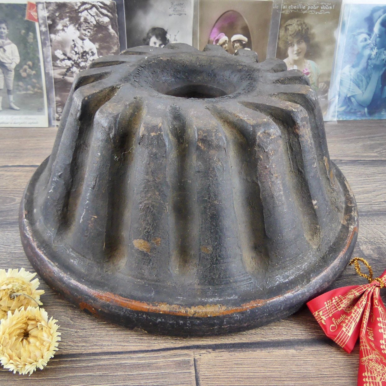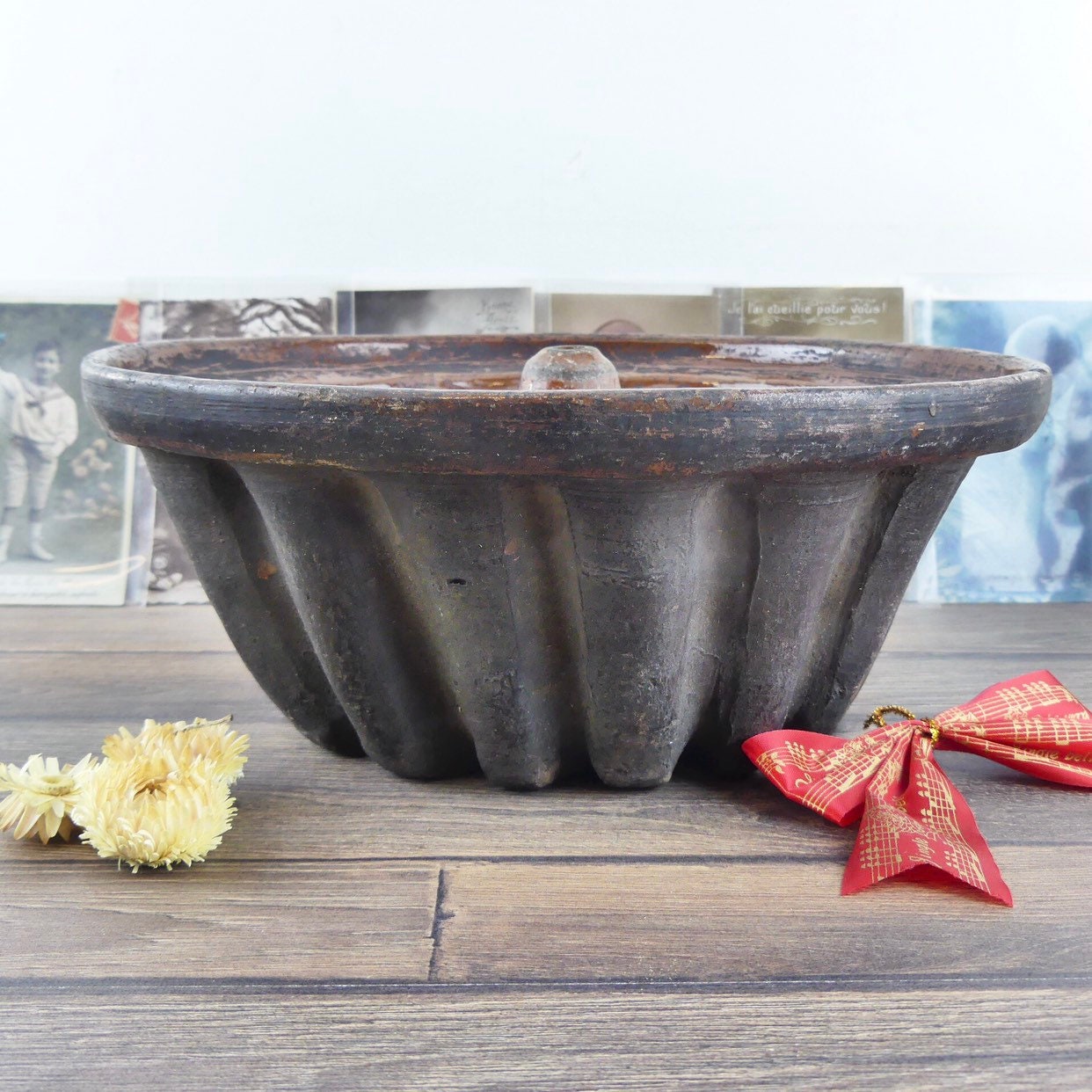 Ancient Alsace mould in terracotta for Kouglof. It is a large terracotta model that has been used in a wood oven. Its black exterior color is typical of this cooking mode. It is typical of folk art. By economy, a coat of varnish was put only inside the object and not outside. A magnificent witness of the Alsatian cuisine of the late 19th and early 20th century. It is not cracked or broken. He just has traces of his use in baking cakes. Nostalgic and delightful!