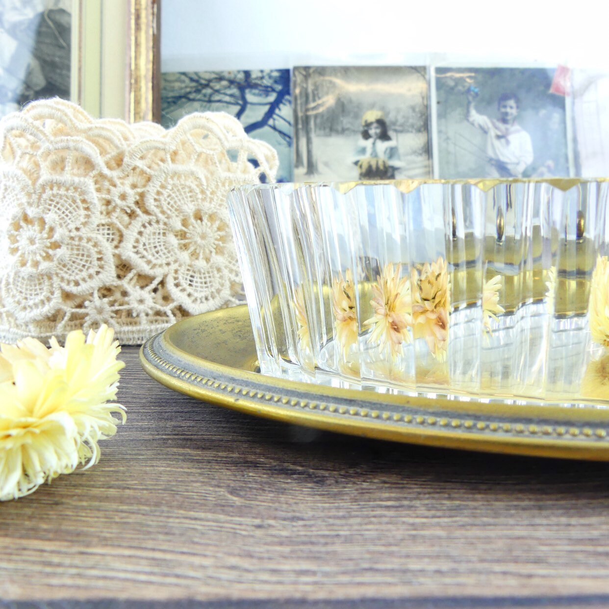 Delightful vintage glass and metal shabby chic spirit. It is very pretty with its lid and its small gilded brass-style tray.